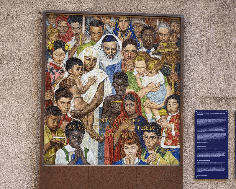 From here, the path leads to the Golden Rule mosaic. It was created based on the image of the artist Norman Rockwell, who depicted people from all over the world in unity and prayer. According to his observations, all major religions have a common golden rule: do unto others as you would have them do unto you. He created the cover illustration for The Saturday Evening Post on April 1, 1961. In 1985, the Thanks-Giving Foundation commissioned a large mosaic reproduction of the Golden Rule.