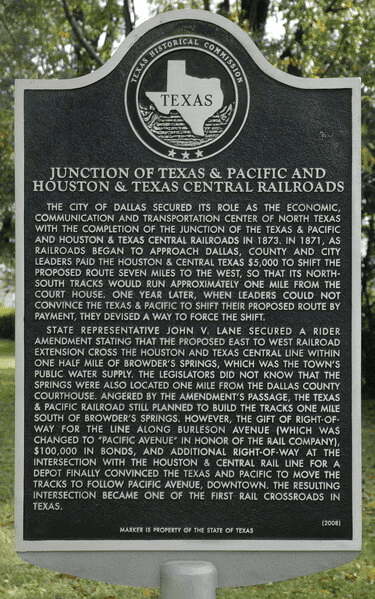 13 ноября 2009 года судья округа Даллас Джим Фостер представил новую историческую памятку, которую установили в честь первых железных дорог города. Достопримечательность расположена на Pacific Avenue под автострадой I-45 в центре Далласа. Именно на этом месте в 1872 году пересекались две важные железнодорожные линии – Houston & Texas Central Railroad и Texas & Pacific Railway. На месте установленной памятки посетители могут увидеть остатки старых железнодорожных путей и представить, как выглядела эта часть города много лет назад.
